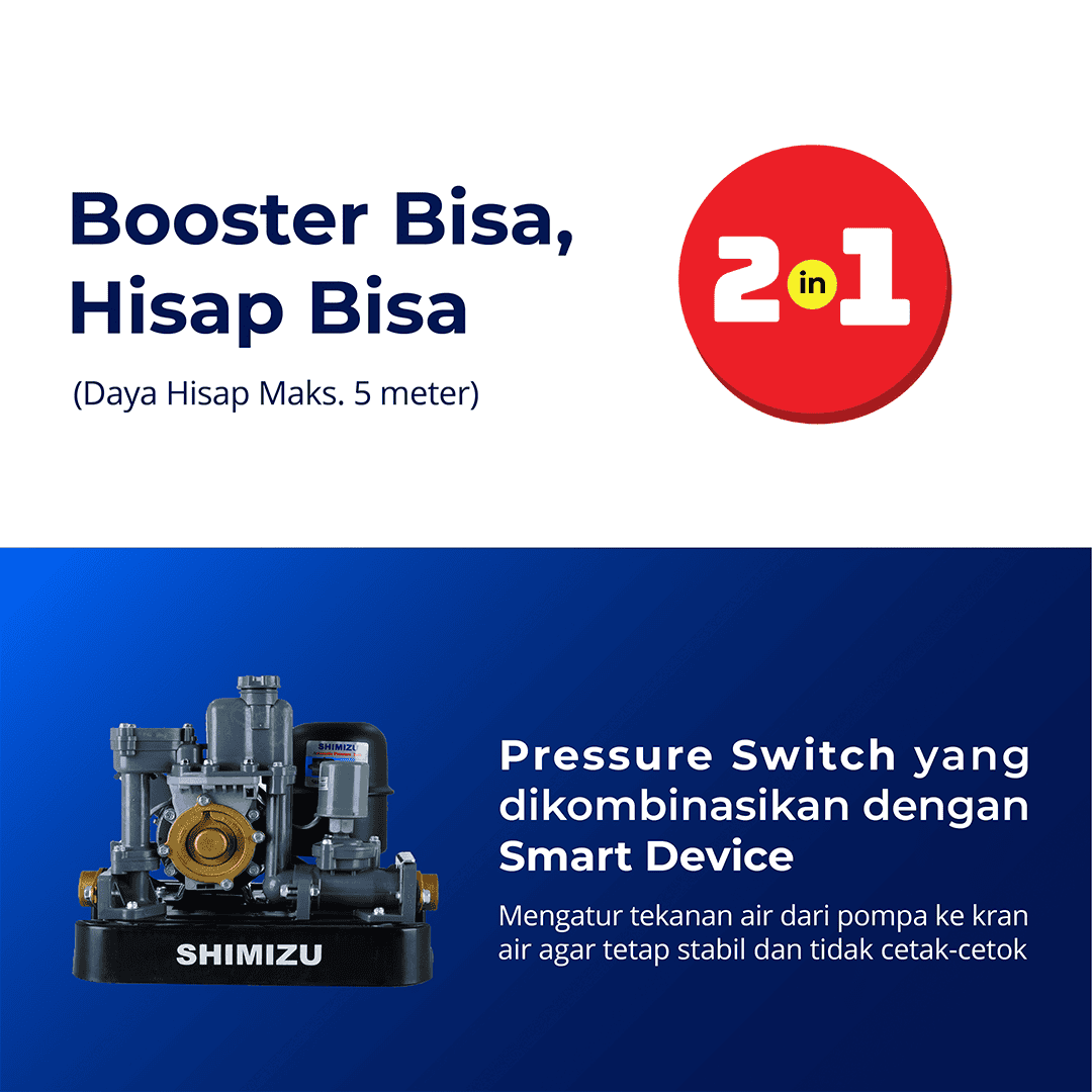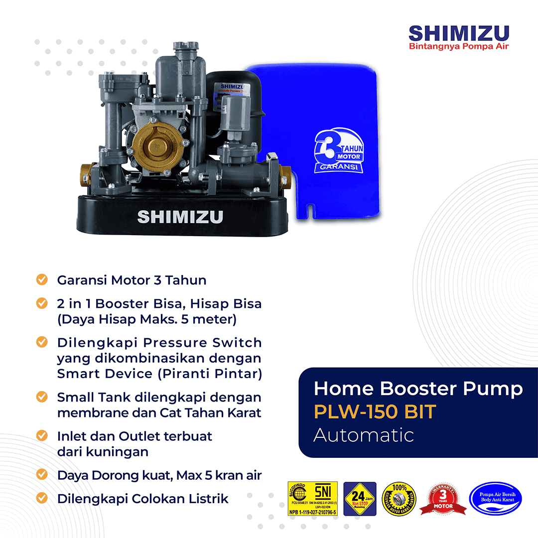 Pompa Booster SHIMIZU PLW-150 BIT merupakan Pompa Dorong yang berfungsi  untuk menstabilkan tekanan air dari toren ke titik-titik kran air yang ada di dalam rumah serta mempunyai Daya Output 150 Watt dan Input 440 Watt.
