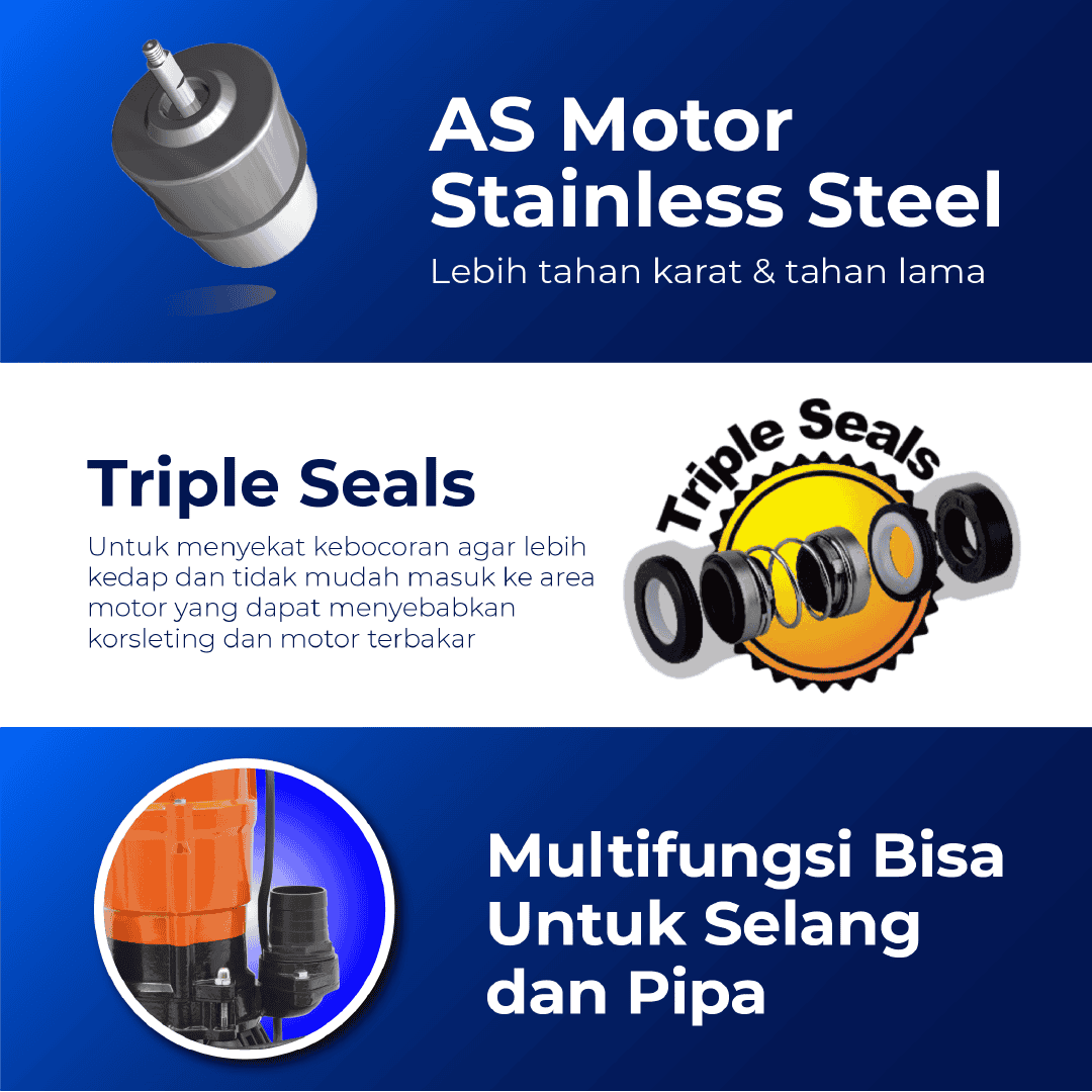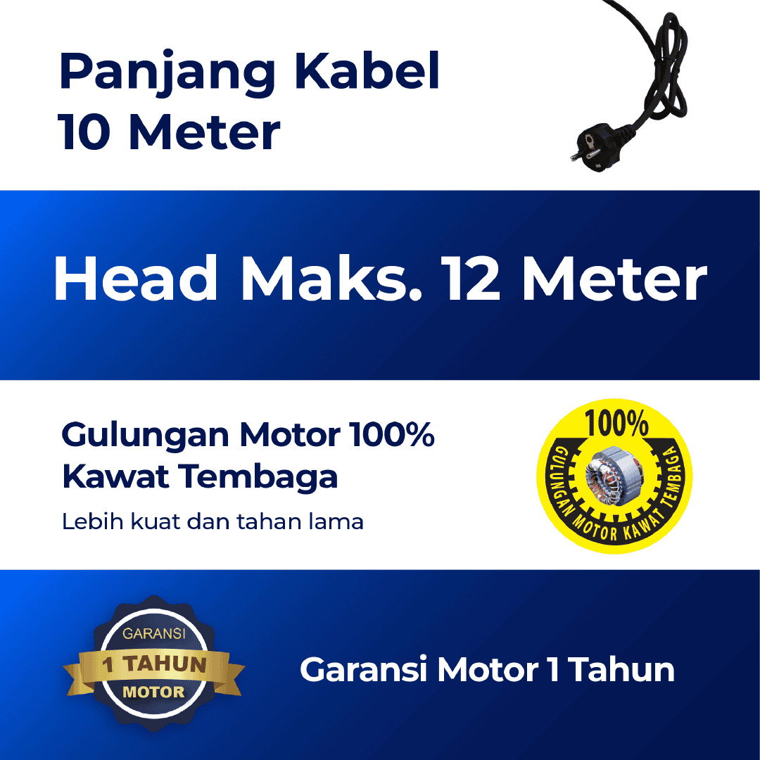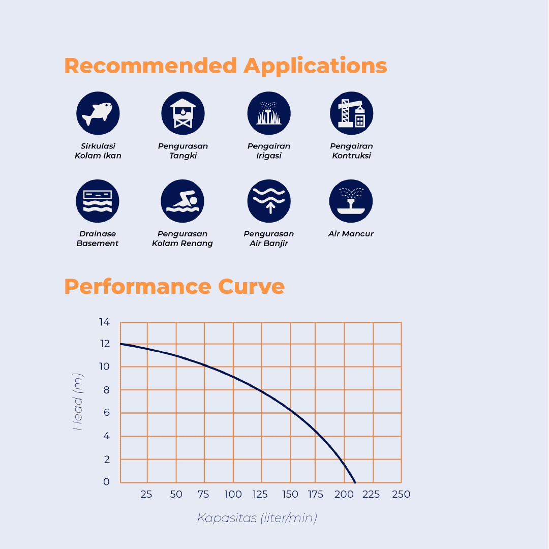 SPW-500 BIT memiliki Head maksimal 12 meter dan batas terendam maksimal 5 meter serta memiliki kapasitas air maksimal 210 Liter/Menit.