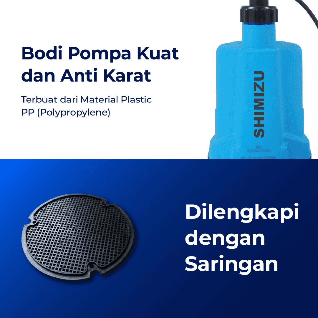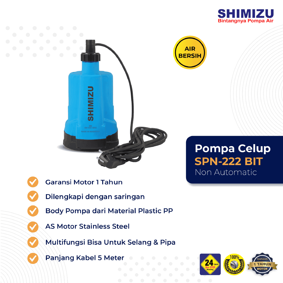 Pompa Celup SHIMIZU SPN-222 BIT memiliki beberapa keunggulan utama yaitu Body Pompa terbuat dari Material Plastic PP (Polypropylene) dan AS Motor terbuat dari Stainless Steel. SPN-222 BIT juga dapat digunakan secara multifungsi bisa untuk selang maupun pipa, dilengkapi saringan, serta memiliki panjang kabel hingga 5 meter. Selain itu, Motor Pompa Celup SHIMIZU menggunakan 100% kawat tembaga sehingga motor lebih kuat, tahan lama, dan tidak mudah terbakar. SPN-222 BIT juga dilengkapi Thermal Protector sebagai pemutus arus otomatis jika motor pompa overheat sehingga motor tidak terbakar.