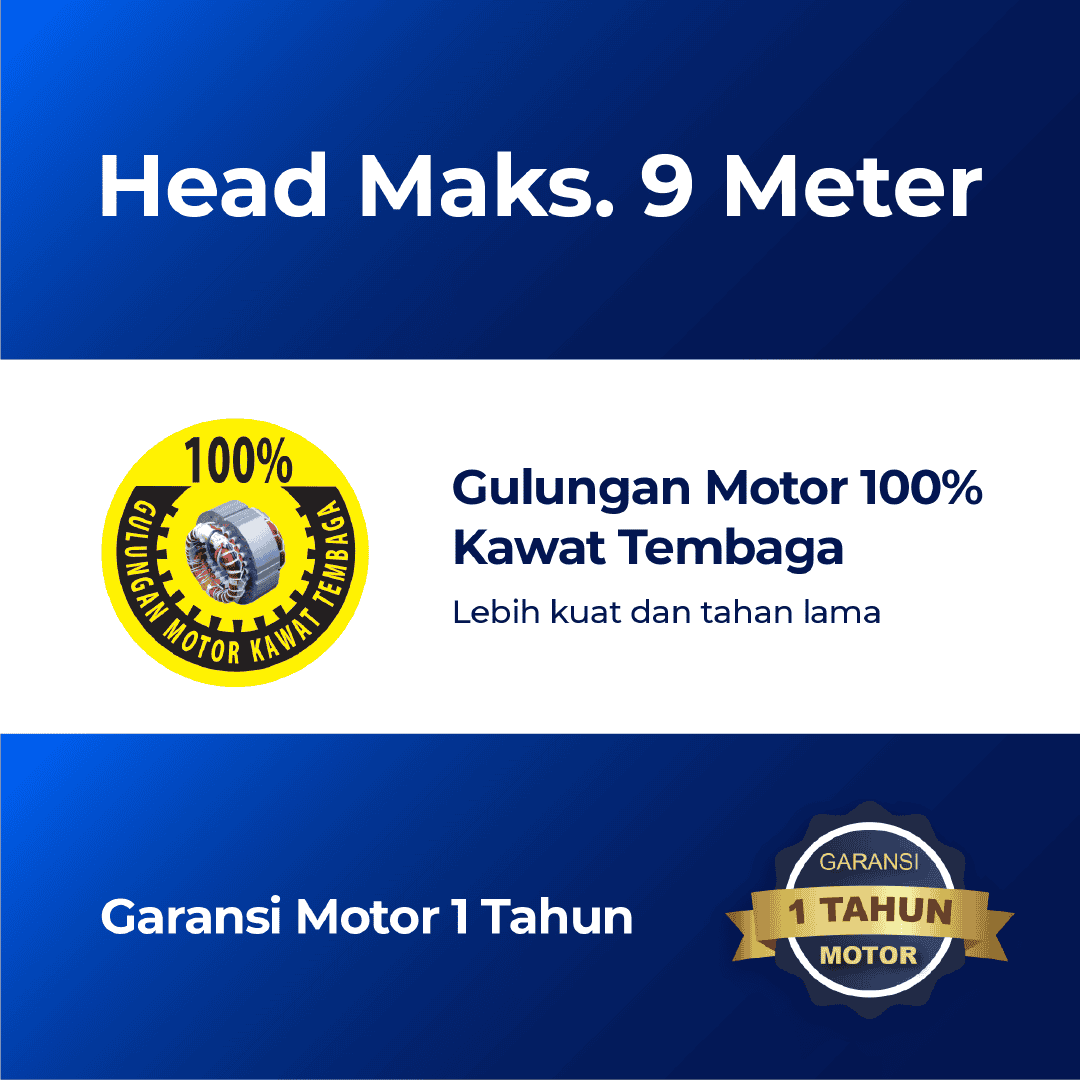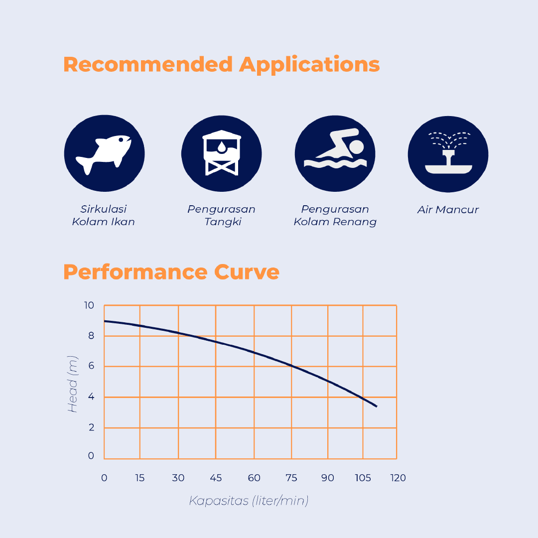 SPN-222 BIT memiliki Head maksimal 9 meter dan batas terendam maksimal 5 meter serta memiliki kapasitas air maksimal 110 Liter/Menit.