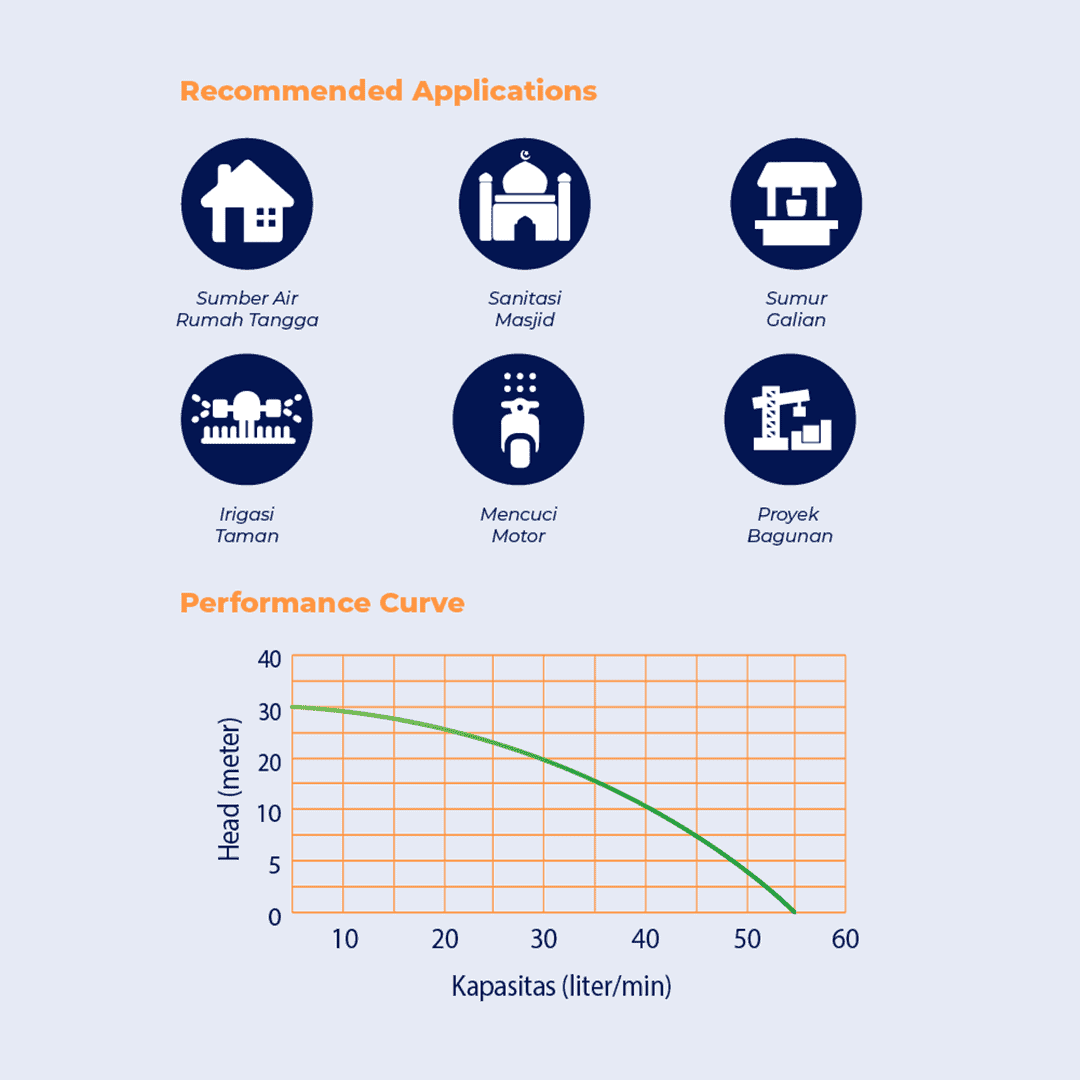 JET-108 BIT memiliki kemampuan Daya Hisap maksimal 11 meter, Total Head maksimal 30 meter dengan kapasitas air maksimal 55 Liter/Menit. Disaat head 5 meter, debit air yang dihasilkan 50 Liter/Menit dan pada saat head 21 meter, debit air yang dihasilkan 7 Liter/Menit.