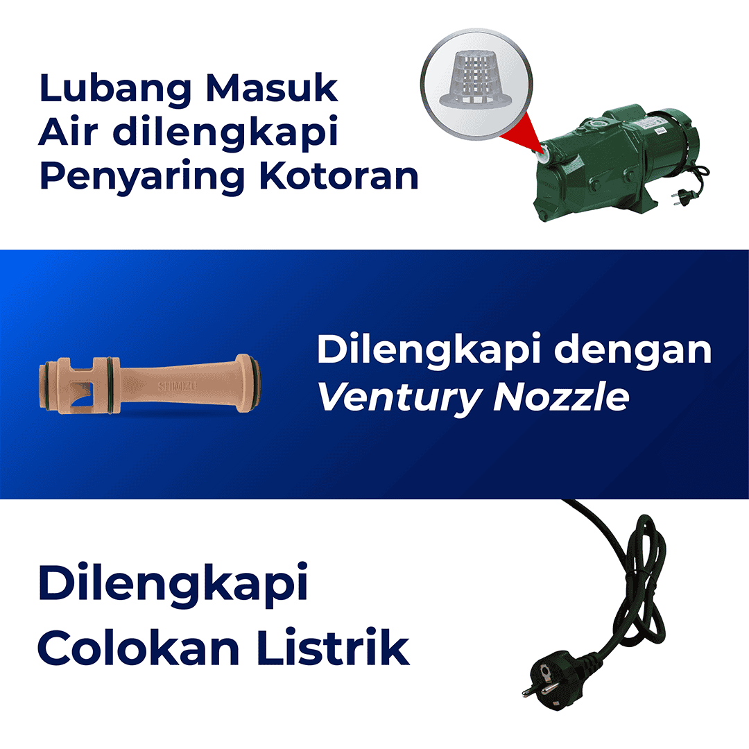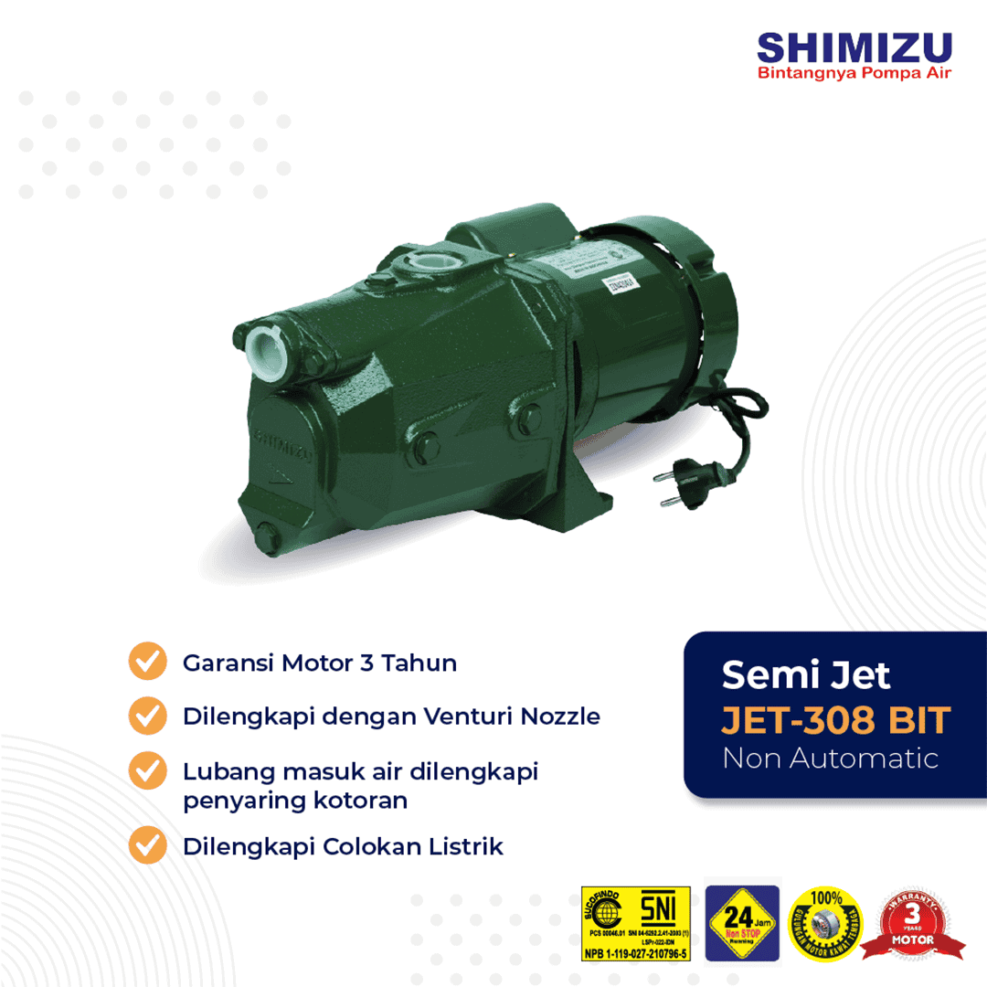 Pompa Air SHIMIZU JET-308 BIT memiliki beberapa keunggulan utama yaitu lubang masuk air (inlet) pada pompa dilengkapi dengan penyaring kotoran agar mencegah batu-batu kecil tidak masuk ke dalam pompa. Selain itu, JET-308 BIT dilengkapi dengan Venturi Nozzle dan colokan listrik.