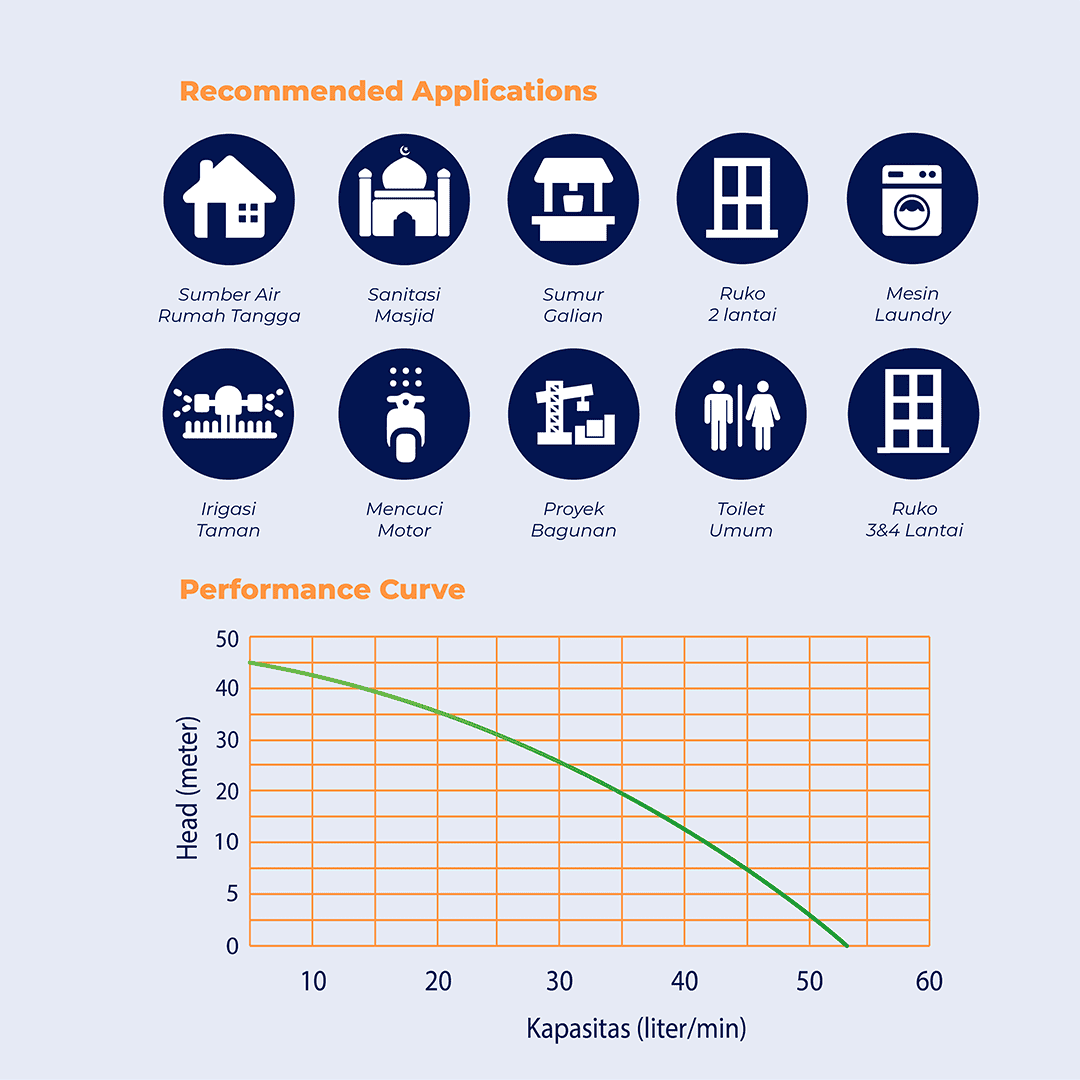 JET-308 BIT memiliki kemampuan Daya Hisap maksimal 11 meter, Total Head maksimal 45 meter dengan kapasitas air maksimal 53 Liter/Menit. Disaat head 10 meter, debit air yang dihasilkan 50 Liter/Menit dan pada saat head 35 meter, debit air yang dihasilkan 16 Liter/Menit.