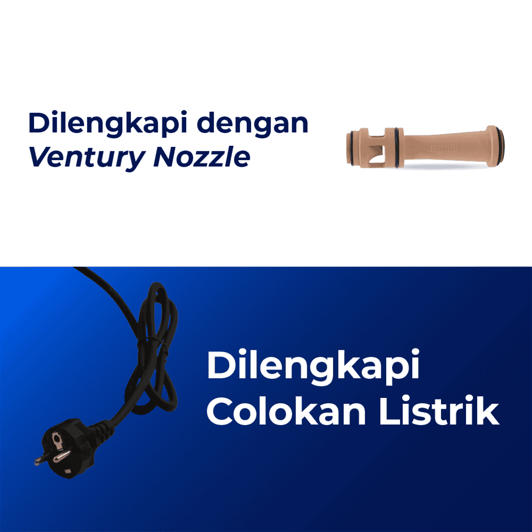 Pompa Air SHIMIZU JET-100 BIT memiliki 2 keunggulan utama yaitu dilengkapi dengan Venturi Nozzle dan colokan listrik. keunggulan lainnya yaitu Motor Pompa SHIMIZU menggunakan 100% kawat tembaga sehingga motor lebih kuat, tahan lama dan tidak mudah terbakar.
