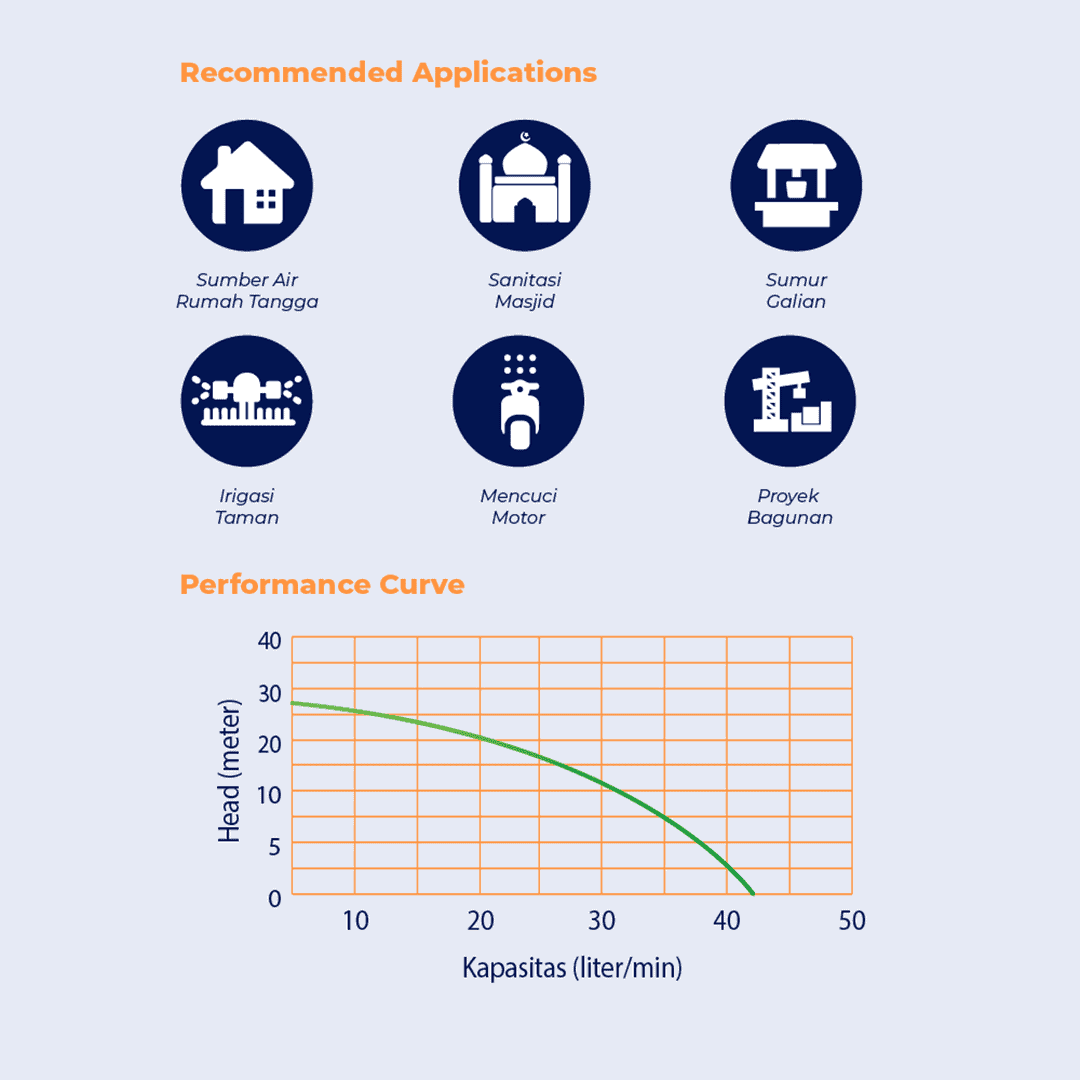 JET-100 BIT memiliki kemampuan Daya Hisap maksimal 11 meter, Total Head maksimal 28 meter dengan kapasitas air maksimal 42 Liter/Menit. Disaat head 5 meter, debit air yang dihasilkan 41 Liter/Menit dan pada saat head 20 meter, debit air yang dihasilkan 7 Liter/Menit.