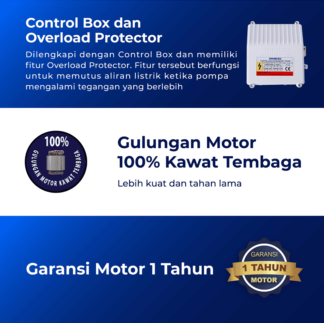 Pompa Submersible SHIMIZU SPG20-311K BIT memiliki beberapa keunggulan utama yaitu Body Pompa Full Stainless Steel SUS 304 dengan kualitas anti karat terbaik sehingga tahan terhadap korosi. Kabel NYYHY khusus untuk pompa rendam dengan panjang kabel 40 Meter serta menggunakan sistem Plug In Cable yang mempermudah proses lepas dan pasang kabel pada saat instalasi. Selain itu, Inlet Pompa dari bahan Stainless Steel SUS 304 dan Outlet Pompa dari bahan kuningan serta Big Clearance (Ruang Impeller lebih besar sehingga pompa lebih tahan macet). SPG20-311K BIT memiliki 11 Impeller dari material POM dan dilengkapi Control Box serta Overload Protector untuk memutus arus listrik ketika pompa mengalami tegangan berlebih.