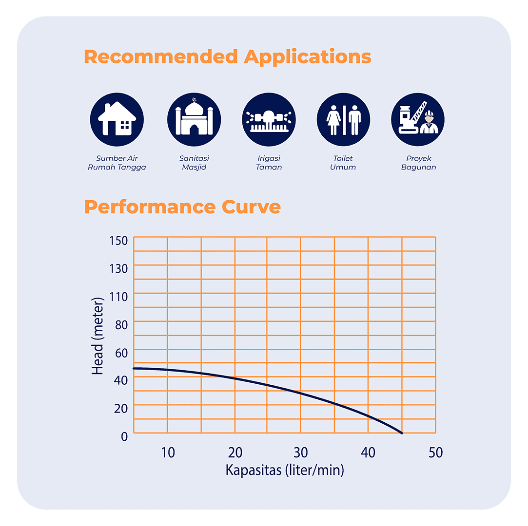 SPG20-311K BIT memiliki Total Head maksimal 47 meter. Disaat head 43 meter, debit air yang dihasilkan 20 Liter/Menit dan pada saat head 31 meter, debit air yang dihasilkan 35 Liter/Menit serta saat head 19 meter, debit air yang dihasilkan 45 Liter/Menit.