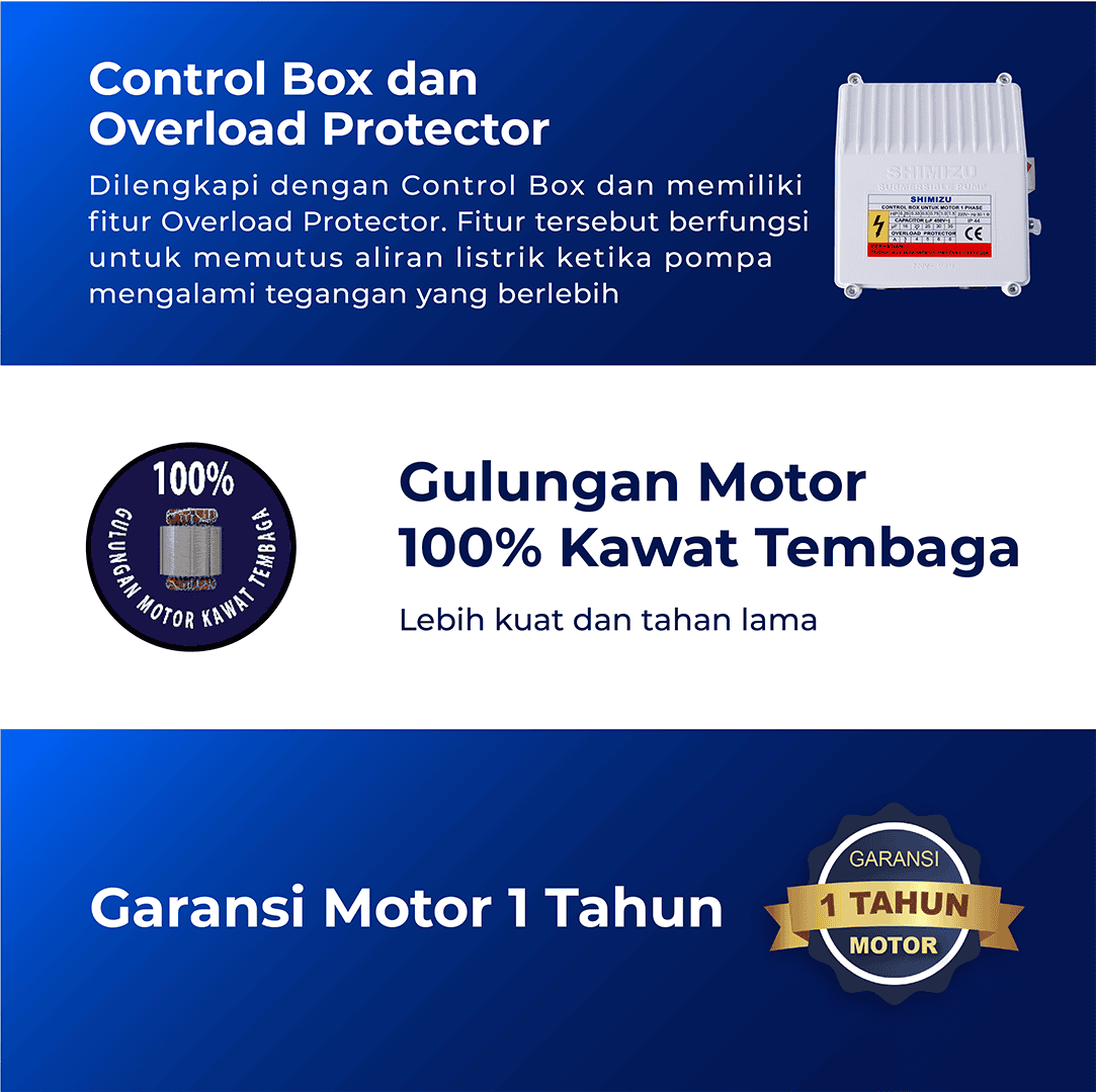 Pompa Submersible SHIMIZU SPG20-321K BIT merupakan pompa satelit 3 inch yang dirancang khusus untuk sumur dalam dengan posisi pompa terendam air guna memenuhi kebutuhan air bersih dan sangat cocok dipakai untuk sumber air rumah tangga serta mempunyai Tenaga Motor 0.75 HP, Daya Output 550 Watt dan Input 920 Watt.
