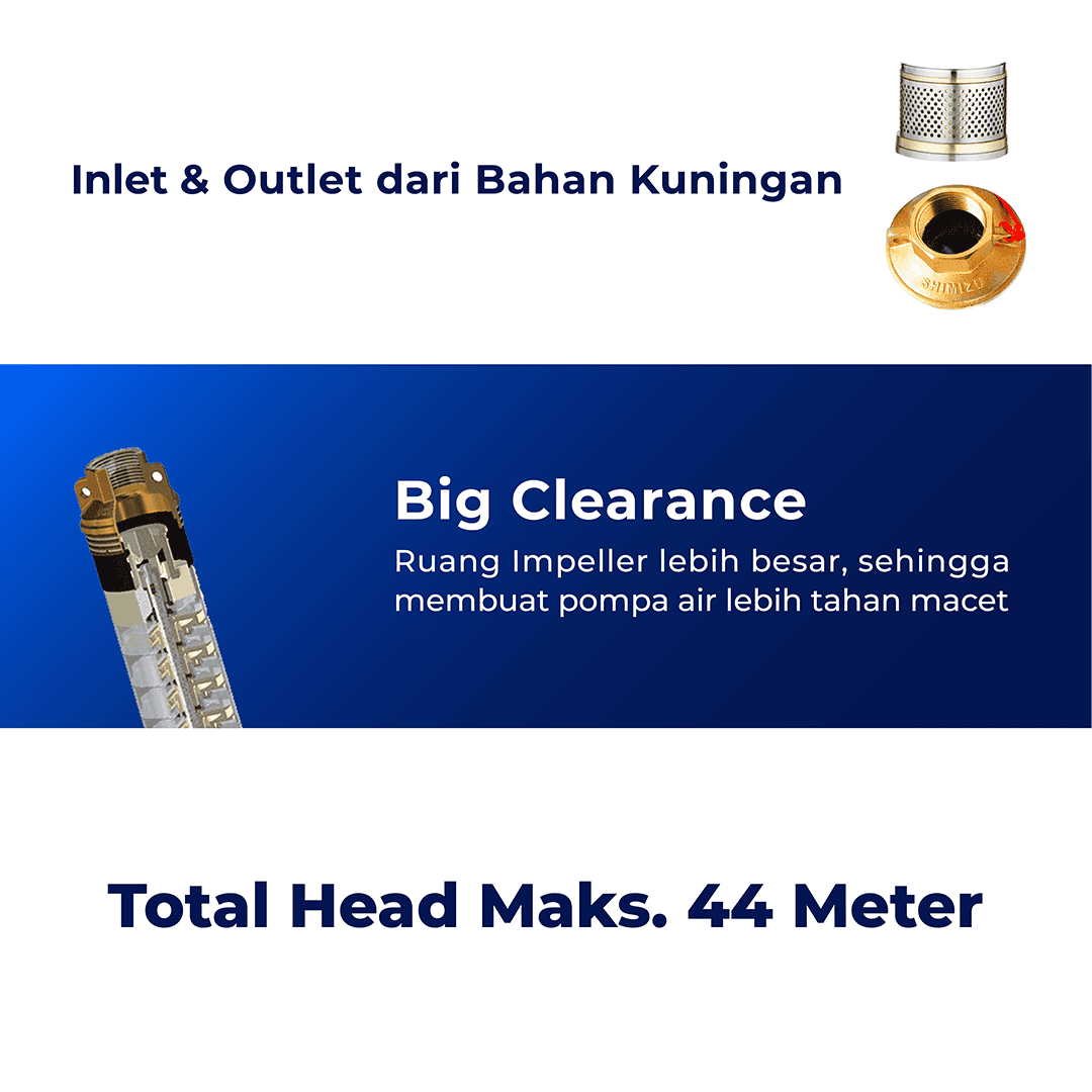 Pompa Submersible SHIMIZU SPG30-311 BIT memiliki beberapa keunggulan utama yaitu Body Pompa terbuat dari Full Stainless Steel dan kabel NYYHY dengan panjang kabel 1 Meter serta menggunakan sistem Plug In Cable. Selain itu, Inlet dan Outlet Pompa terbuat dari bahan kuningan serta Big Clearance (Ruang Impeller lebih besar sehingga pompa lebih tahan macet). SPG30-311 BIT memiliki proses instalasi yang mudah (Tanpa Control Box), memiliki 11 Impeller dari bahan material POM, dan Thermal Protector yaitu pemutus arus otomatis jika motor pompa overheat sehingga motor tidak terbakar.
