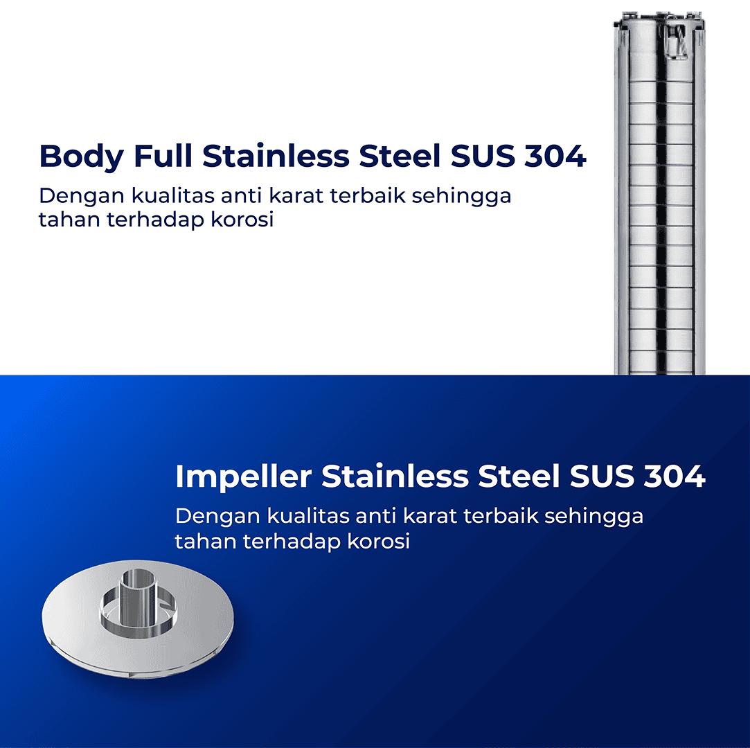 Pompa Submersible SHIMIZU SS-413K BIT memiliki beberapa keunggulan utama yaitu Body Pompa Full Stainless Steel SUS 304 dengan kualitas anti karat terbaik sehingga tahan terhadap korosi. Kabel NYYHY khusus untuk pompa rendam dengan panjang kabel 50 Meter serta menggunakan sistem Plug In Cable yang mempermudah proses lepas dan pasang kabel pada saat instalasi. Selain itu, Inlet dan Outlet Pompa terbuat dari bahan Stainless Steel SUS 304, dilengkapi penghancur batu kecil (Small Stone Crusher) serta Big Clearance (Ruang Impeller lebih besar sehingga pompa lebih tahan macet). SS-413K BIT memiliki 13 Impeller dari material Stainless Steel SUS 304 dan dilengkapi Control Box serta Overload Protector untuk memutus arus listrik ketika pompa mengalami tegangan berlebih.