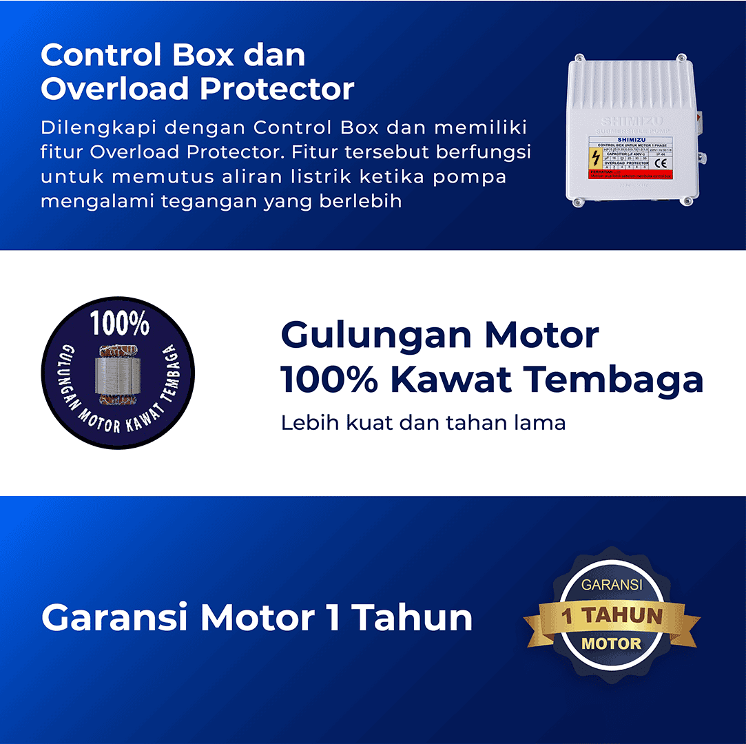 Pompa Submersible SHIMIZU SS-413K BIT merupakan pompa satelit 4 inch yang dirancang khusus untuk sumur dalam dengan posisi pompa terendam air guna memenuhi kebutuhan air bersih dan sangat cocok dipakai untuk sumber air rumah tangga serta mempunyai Tenaga Motor 0.75 HP, Daya Output 550 Watt dan Input 1.030 Watt.