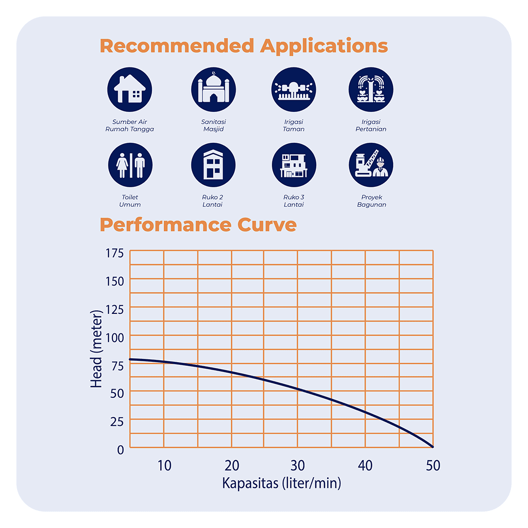 SS-413K BIT memiliki Total Head maksimal 78 meter. Disaat head 73 meter, debit air yang dihasilkan 10 Liter/Menit dan pada saat head 54 meter, debit air yang dihasilkan 30 Liter/Menit serta saat head 13 meter, debit air yang dihasilkan 50 Liter/Menit.