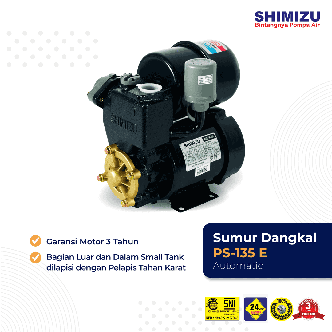 Pompa Air SHIMIZU PS-135 E merupakan pompa sumur dangkal otomatis yang dapat diandalkan untuk memenuhi kebutuhan air bersih dan sangat cocok dipakai untuk sumber air rumah tangga serta mempunyai Daya Output 125 Watt dan Input 330 Watt.