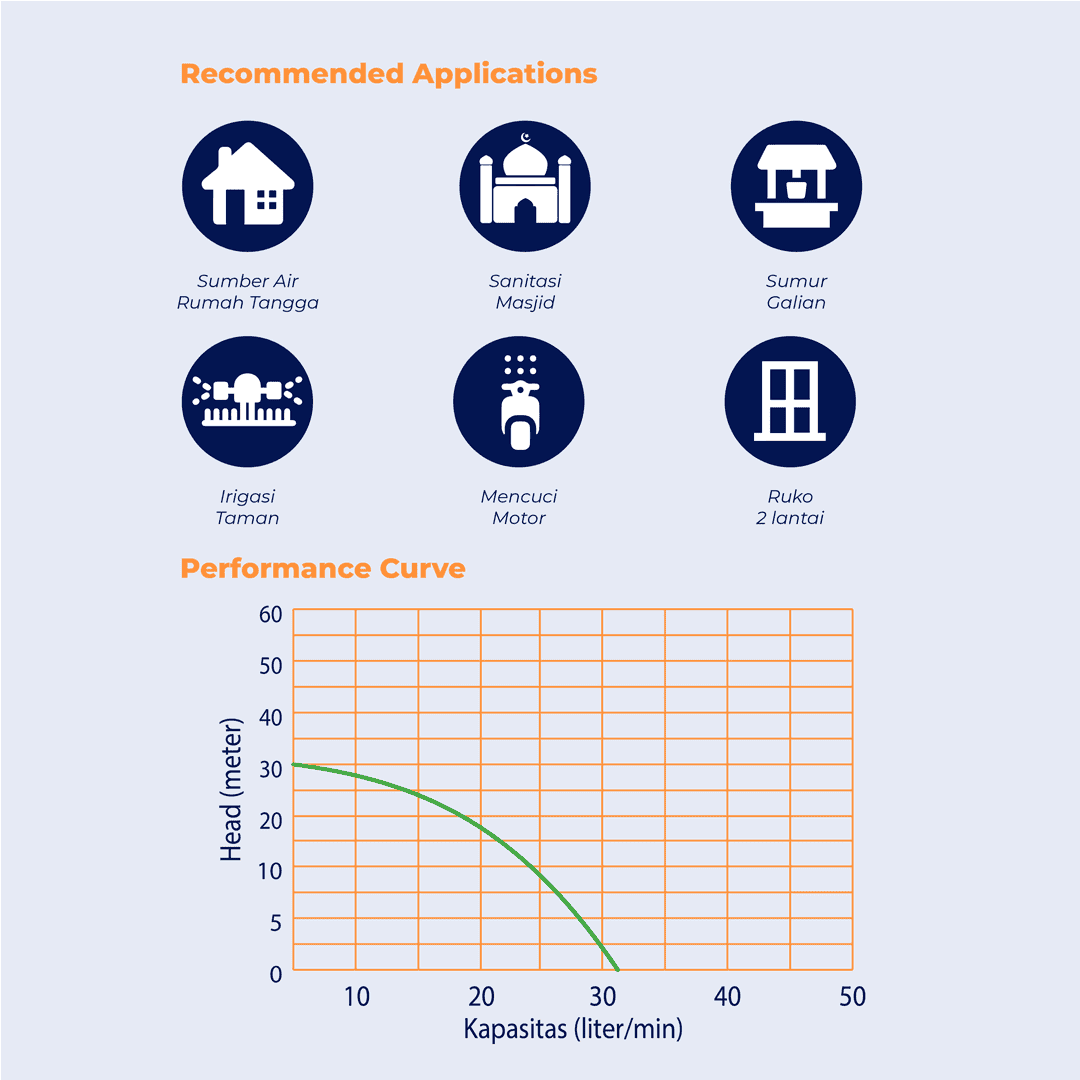 PS-135 E memiliki kemampuan Daya Hisap maksimal 9 meter, Total Head maksimal 30 meter, dengan kapasitas air maksimal 31 Liter/Menit. Disaat head 5 meter debit air yang dihasilkan 28 Liter/Menit dan pada saat head 20 meter debit air yang dihasilkan 10 Liter/Menit.