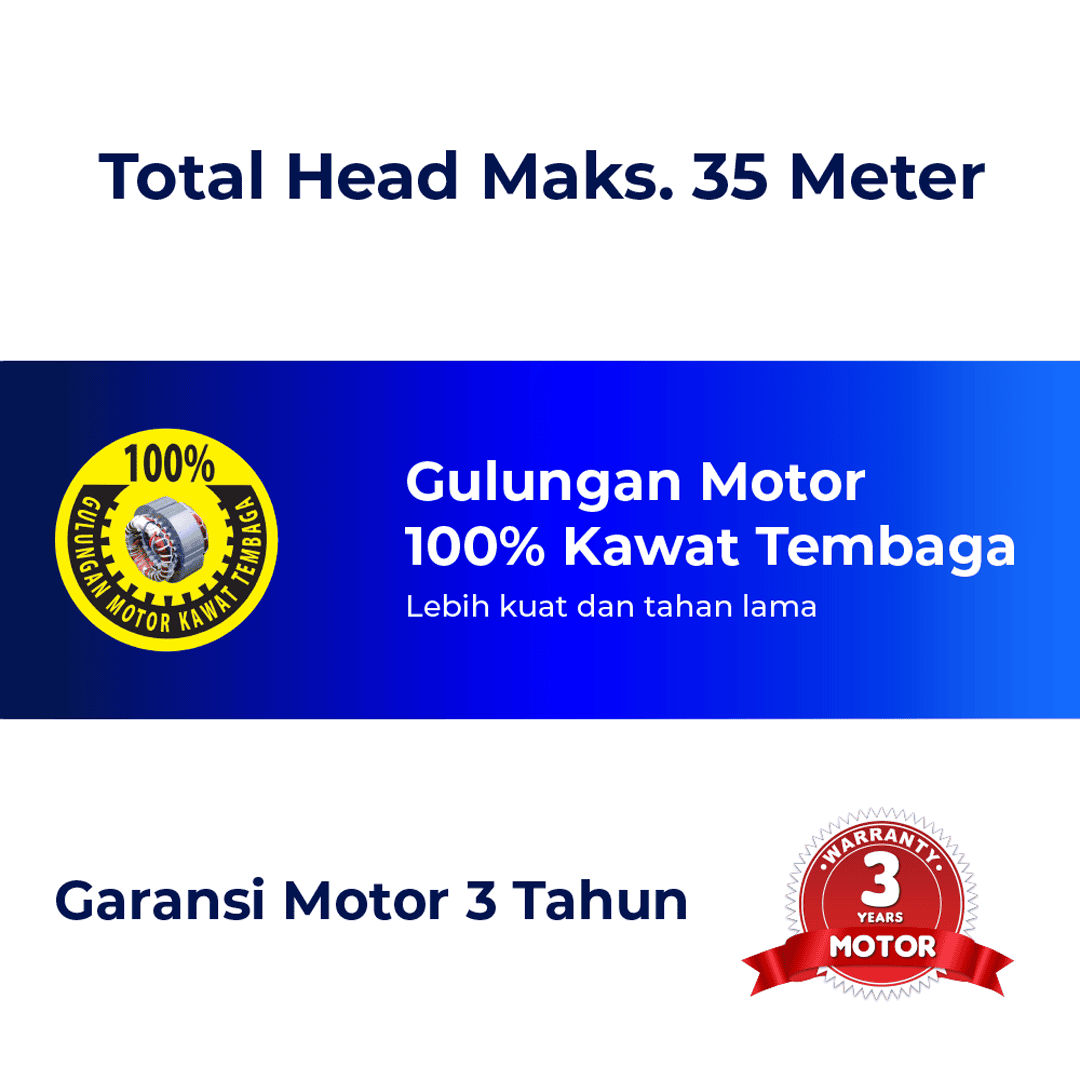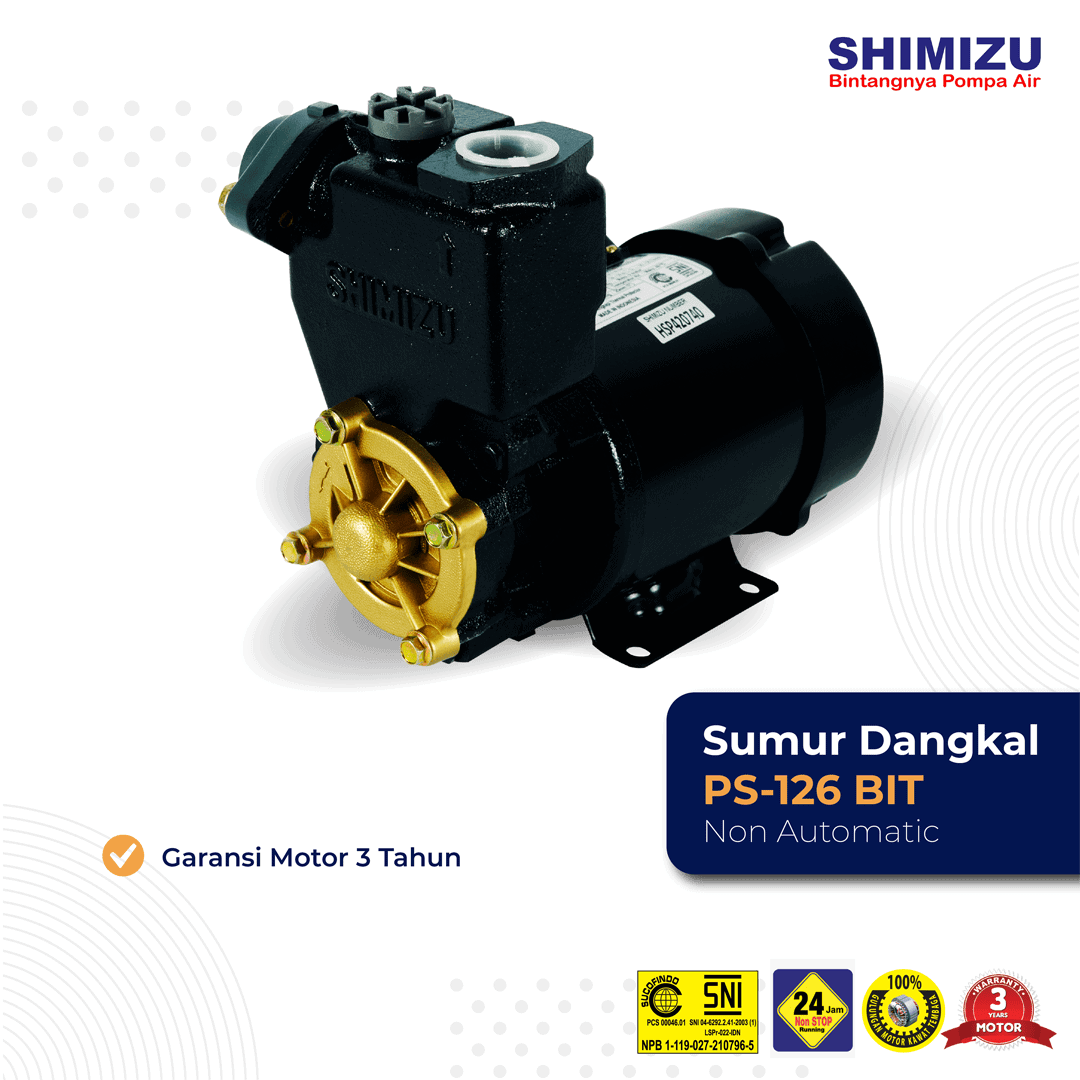 Salah satu keunggulan Pompa Air SHIMIZU PS-126 BIT yaitu Motor pompa SHIMIZU menggunakan 100% kawat tembaga sehingga motor lebih kuat, tahan lama, dan tidak mudah terbakar. Selain itu, PS-126 BIT juga dilengkapi dengan Thermal Protector yaitu pemutus arus otomatis jika motor pompa overheat sehingga motor tidak terbakar. SHIMIZU memberikan Garansi Motor 3 tahun dan Garansi Jasa Service serta Sparepart 1 tahun.